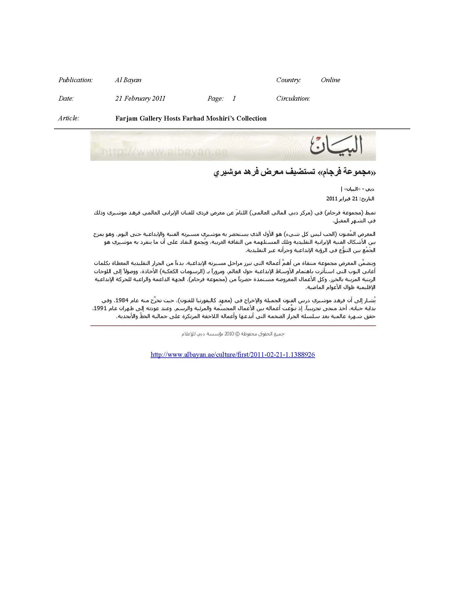Farhad Moshiri studied Fine Arts and filmmaking at California Institute of the Arts, graduating in 1984. His first works experimented with various artistic mediums, including installations, video art and painting. Having returned to Tehran in 1991, he rose to international acclaim with his series of monumental jar paintings, followed by highly textured works incorporating both calligraphy and numerical abdjad; an ancient Arabic clerical code.